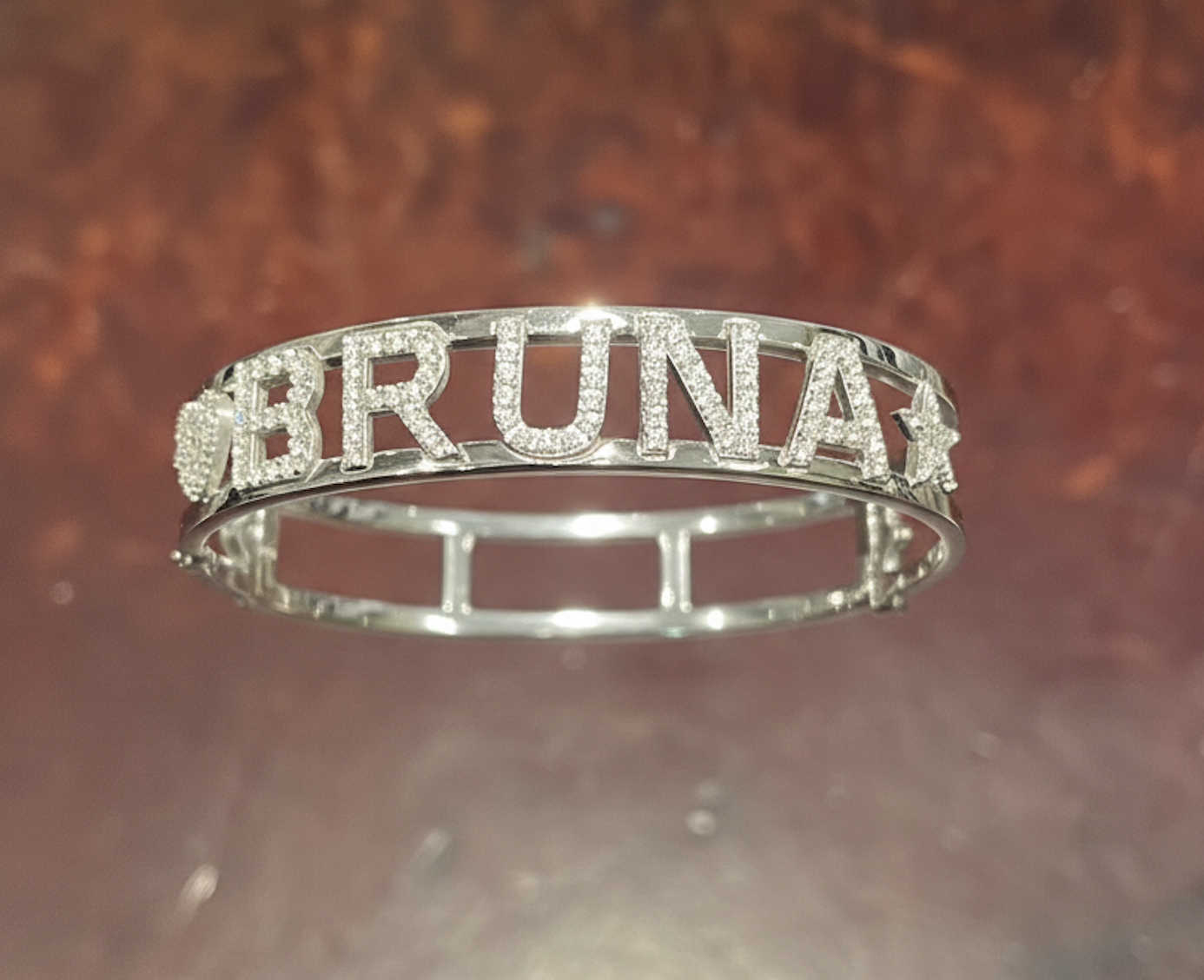 Bracciale rigido personalizzato in argento 925 o oro 18 kt con pavรฉ di zirconi o brillanti, realizzato su richiesta con lettere o simboli. Disponibile in circa 10 giorni.