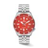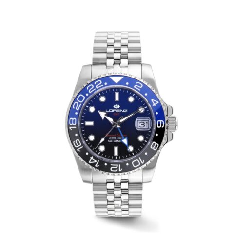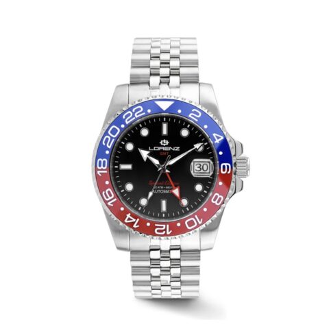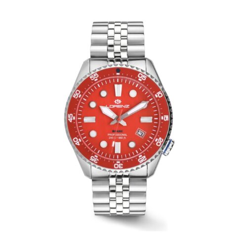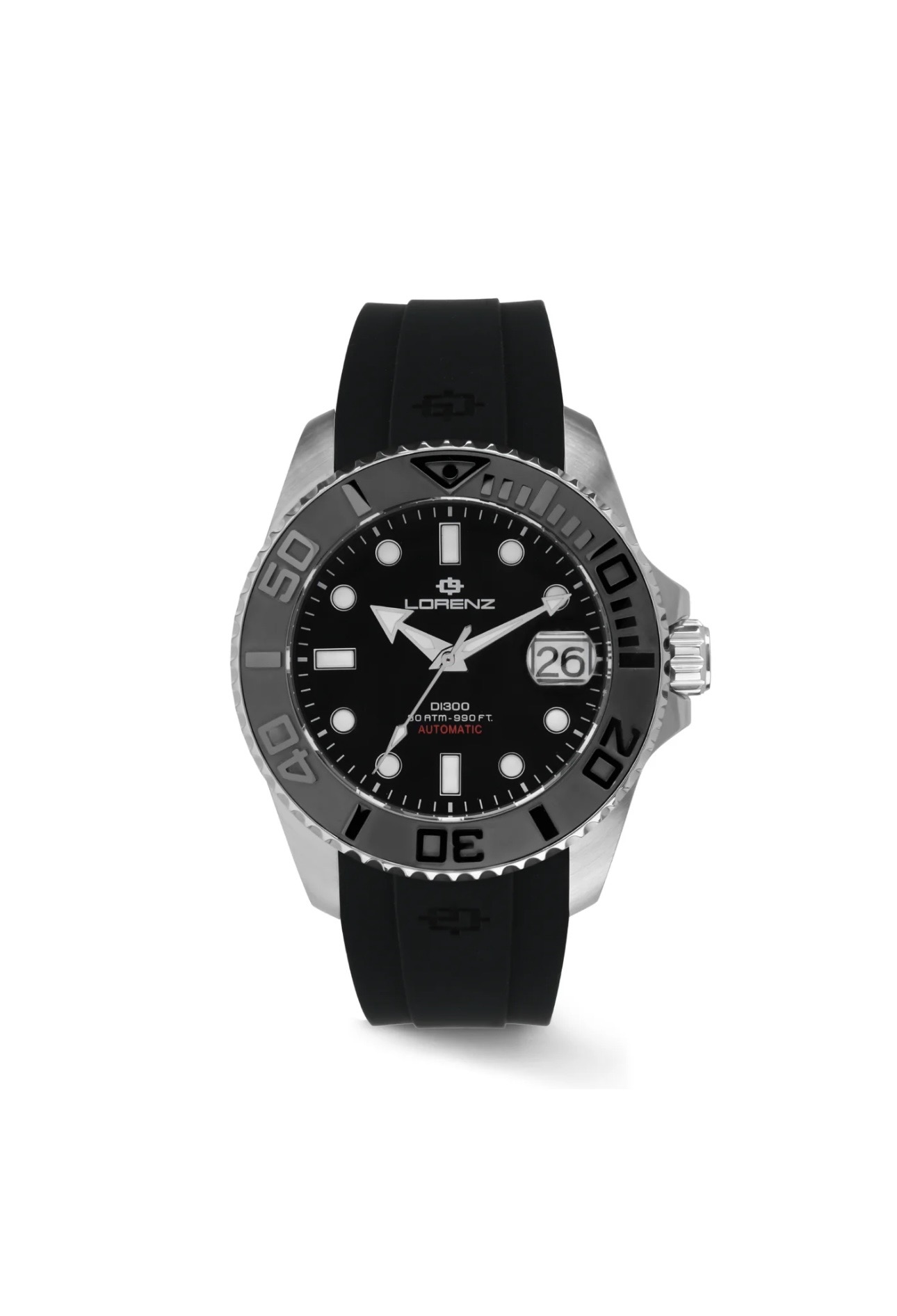 Orologio Lorenz da uomo linea “DI300” solo tempo con movimento automatico giapponese Seiko NH35. Cassa in acciaio 316L con diametro 42 mm, fondello e corona a vite. Lunetta unidirezionale in ceramica solida, vetro zaffiro con lente sul datario e quadrante nero. Cinturino in gomma accorciabile e fibbia déployante con sicurezza. Resistente all’acqua 30 atmosfere (300 metri).